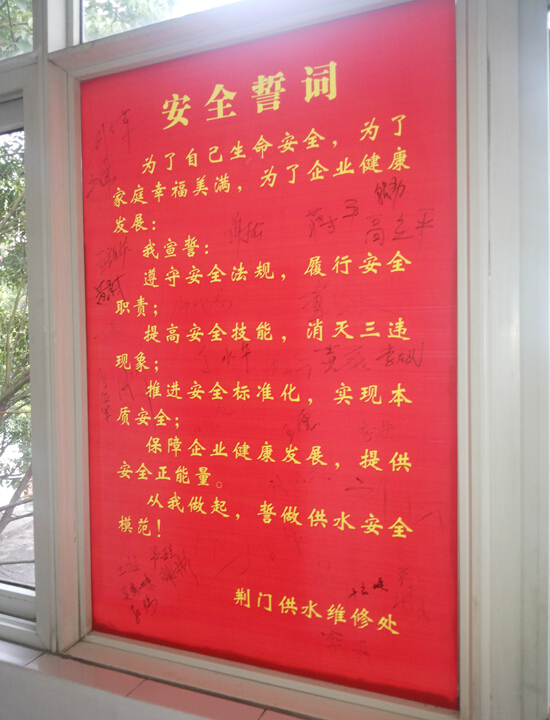 維修處維修工作點多面廣,施工環(huán)境日益復雜,安全生產形勢面臨嚴峻挑戰(zhàn)。抓好安全生產各項工作是維修處一直常抓不懈的一項重要工作,而探討不拘一格的安全生產管理模式和多渠道、多形式的全員安全教育培訓方式也一直是維修處創(chuàng)新安全管理方式、適應安全管理新常態(tài)的重要舉措。全員安全宣誓是我處今年安全生產月的一大亮點,全體人員由處領導帶隊在宣誓墻下莊嚴宣誓:“為了自己生命安全,為了家庭幸福美滿,為了企業(yè)健康發(fā)展,我宣誓……從我做起,誓做供水安全模范!”