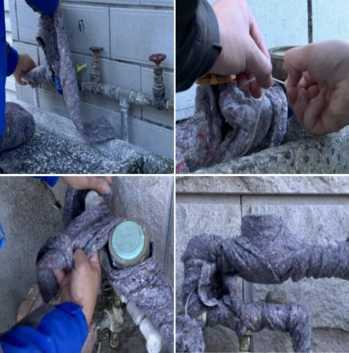 荊門城區(qū)水表箱多為地埋式,我們因地制宜,用沙子或黃土給水表“蓋被子”,并在水表箱周圍用泡沫墊、棉衣或海綿進(jìn)行填充,達(dá)到防凍目的。