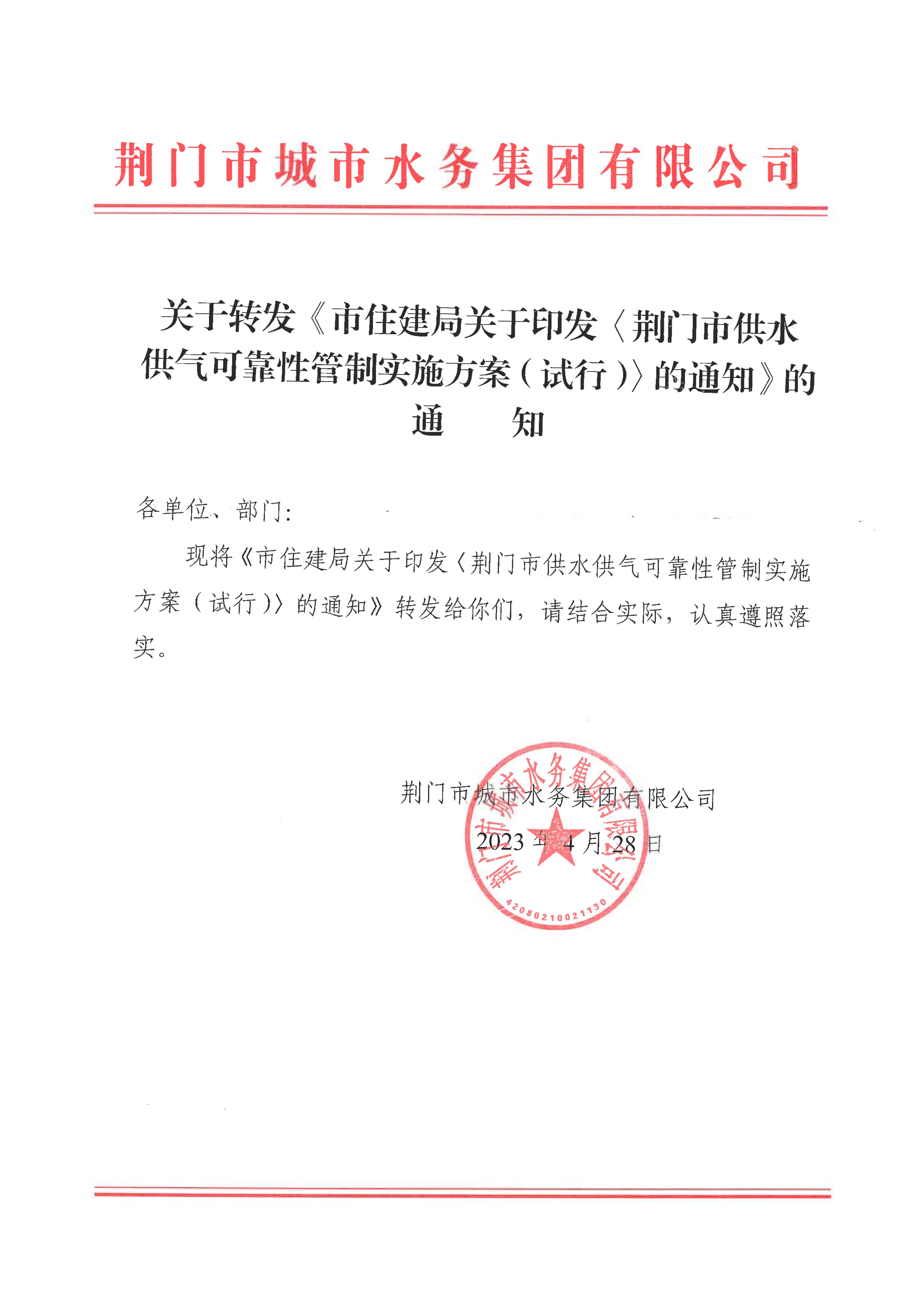 關(guān)于轉(zhuǎn)發(fā)《荊門市供水供氣可靠性管制實施方案(試行)》的通知