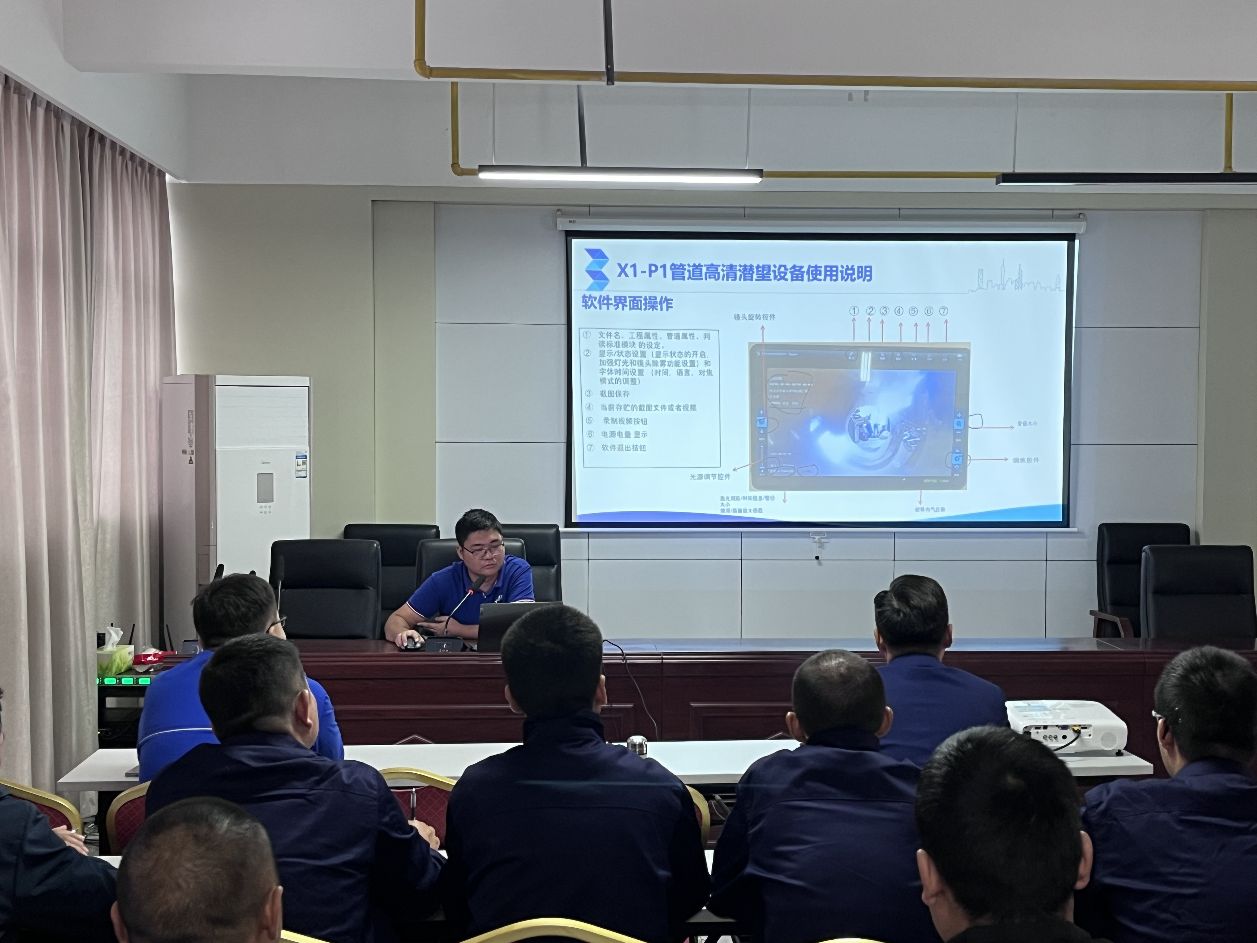 本次培訓(xùn)采用“理論+實操”相結(jié)合模式。理論授課環(huán)節(jié),授課老師圍繞CCTV管道檢測機器人工作原理、設(shè)備結(jié)構(gòu)組成、操作規(guī)范及安全注意事項等內(nèi)容,通過PPT展示和應(yīng)用案例開展系統(tǒng)授課。參訓(xùn)員工全神貫注,詳細(xì)記錄操作要點,積極與老師互動交流,對這位“新伙伴”有了初步的理論認(rèn)知。