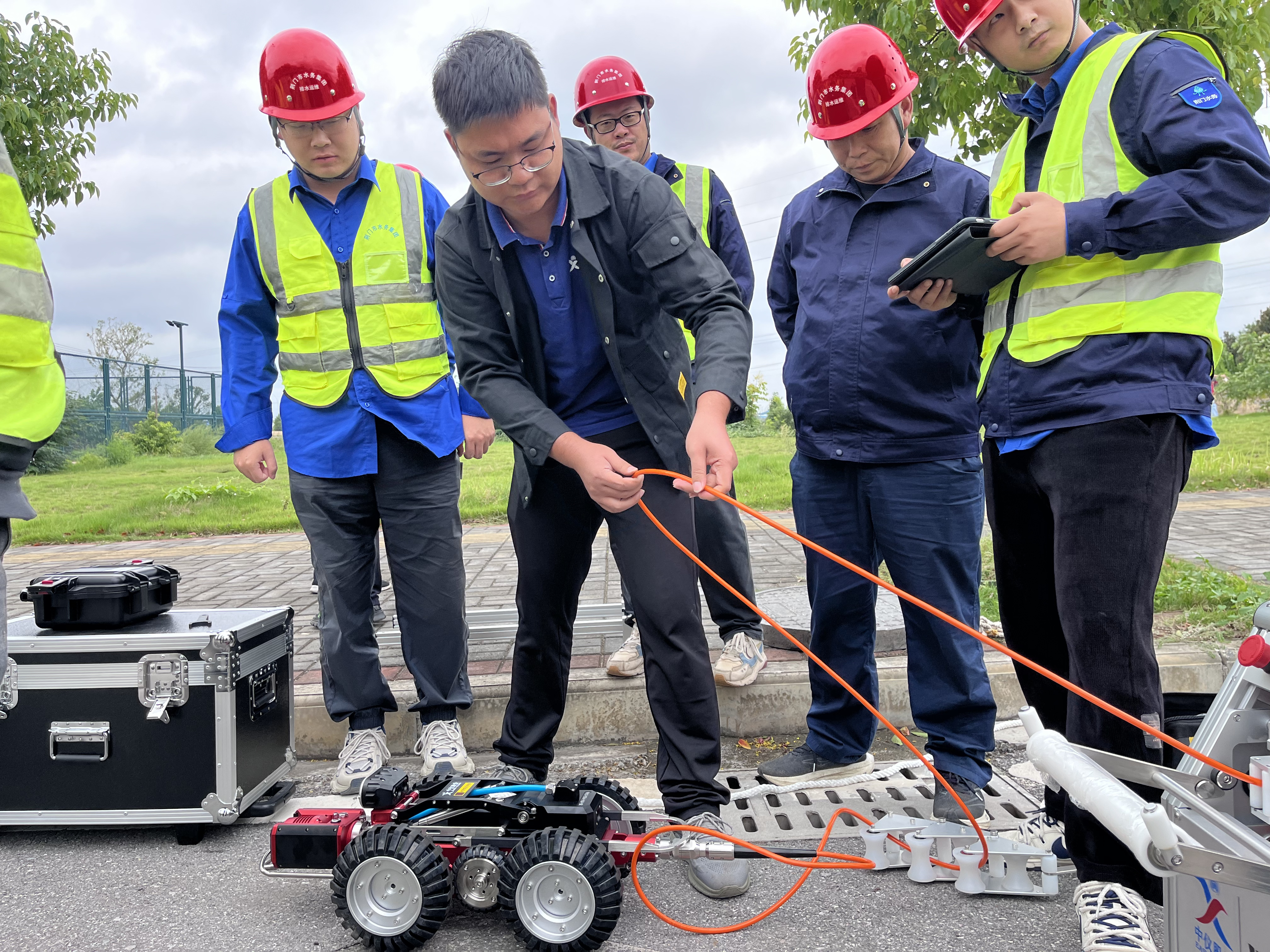 隨后,實戰(zhàn)演練正式拉開帷幕。在管道排查現(xiàn)場,參訓(xùn)學(xué)員分組實操,授課老師全程跟蹤指導(dǎo),及時糾錯,確保每位員工都能熟練掌握機器人的使用技巧。隨著機器人在管道內(nèi)靈活穿梭,高清畫面實時傳輸至控制終端,管道內(nèi)部的每一處細(xì)節(jié)都清晰可見。大家一邊操作,一邊根據(jù)畫面反饋調(diào)整機器人姿態(tài),精準(zhǔn)捕捉管道裂口、錯口、沉降等故障點。