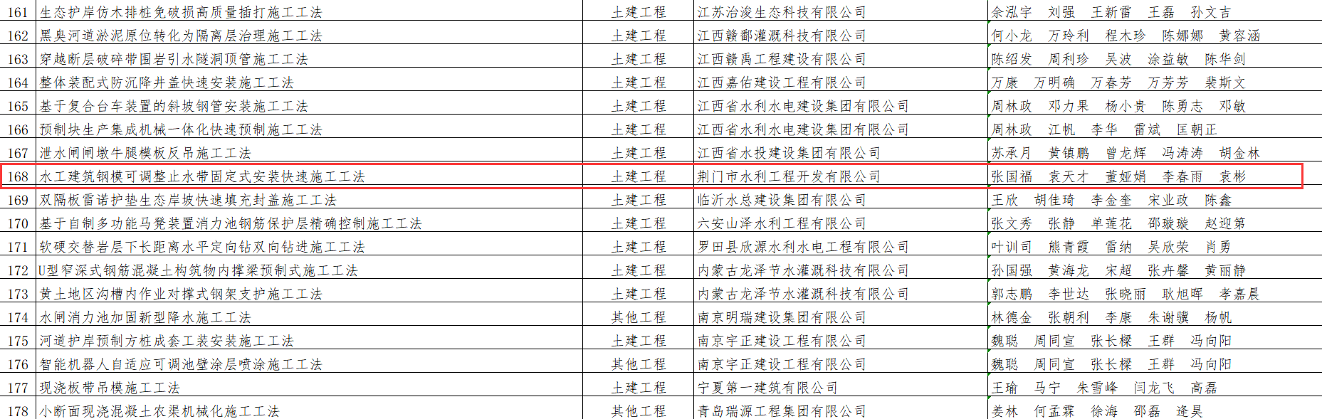 近日,中國(guó)水利工程協(xié)會(huì)公布了2025年度水利行業(yè)工法名單,荊門市城市水務(wù)集團(tuán)有限公司下屬單位荊門市水利工程開(kāi)發(fā)有限公司(以下簡(jiǎn)稱“荊門水發(fā)”)申報(bào)的“水工建筑鋼??烧{(diào)整止水帶固定式安裝快速施工工法”順利通過(guò)評(píng)審,正式被確認(rèn)為中國(guó)水利行業(yè)工法,為水利工程標(biāo)準(zhǔn)化、高效化建設(shè)提供了有力支撐。