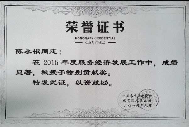近日,公司因服務(wù)“四區(qū)兩園”成績突出,黨委書記、總經(jīng)理陳永根被東寶區(qū)委、區(qū)政府授予“服務(wù)經(jīng)濟發(fā)展工作特別貢獻獎”。