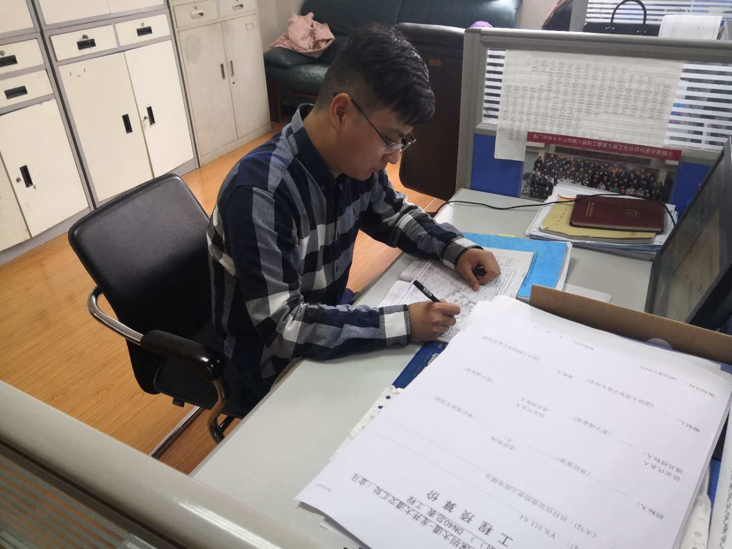 劉貝的主要工作是用戶報(bào)裝接待、現(xiàn)場勘察、圖紙預(yù)算審核傳遞、工程合同擬定、下發(fā)施工通知單、客戶咨詢等。2019年,他共受理用戶現(xiàn)場勘察約700起,平均每周約15起,勘察范圍西至宏圖愛飛客小鎮(zhèn)、東至彭墩長壽產(chǎn)業(yè)園、南至團(tuán)林汽車工業(yè)園、北至子陵萬華工業(yè)園等,全年共擬定各類大小合同約340份,下發(fā)各類施工通知單約500份,從未受到用戶投訴。