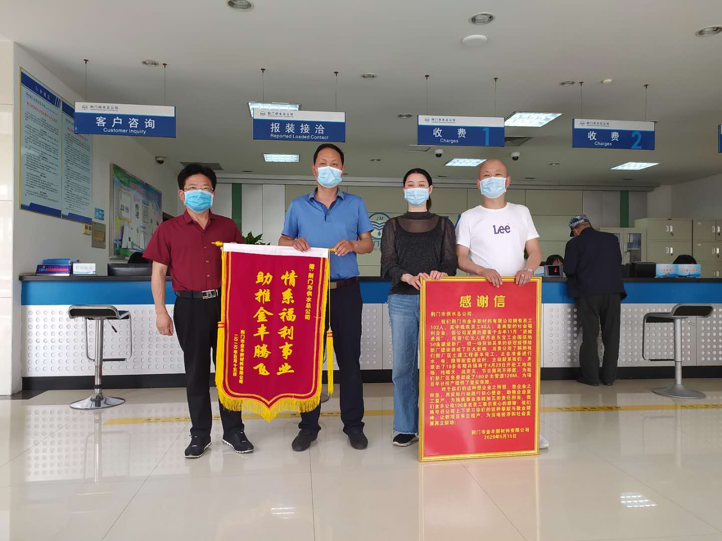 515日,金豐公司總經(jīng)理袁家群和東寶區(qū)工商聯(lián)相關負責人來到市供水總公司,送上感謝信和寫有情系福利事業(yè)  助推金豐騰飛字樣的鮮艷錦旗。