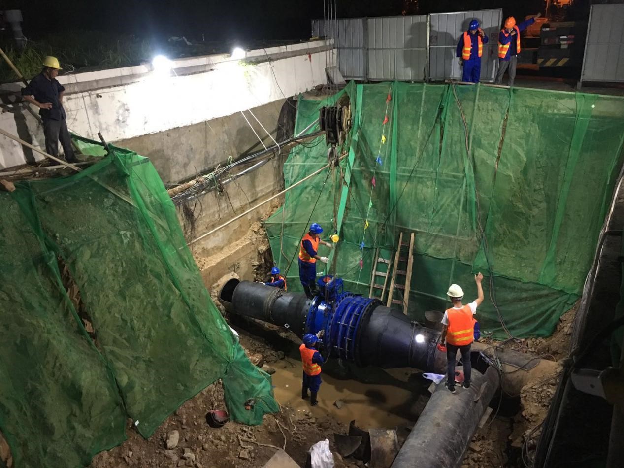 20日晚10時,項目現(xiàn)場管理人員強化工序銜接,緊盯現(xiàn)場監(jiān)督,施工作業(yè)人員挑燈夜戰(zhàn),施工隊伍兵分三路,密切協(xié)調配合,分別對DN1200、DN1000鋼管共5處碰頭點進行施工,管道切割、排水、吊裝、安裝閥門、焊接……施工現(xiàn)場井然有序,一道道工序推進有條不紊,不一會兒工人們的汗水都濕透了全身。21日凌晨2:00突降暴雨,施工人員“硬核”表現(xiàn),克服惡劣天氣的影響,在水中連續(xù)辛勤作業(yè)近10個小時,碰頭任務于218時順利完工。