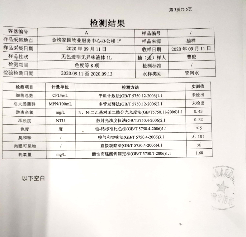 本著“用戶至上”的服務(wù)宗旨,為徹底消除用戶對(duì)荊城自來(lái)水水質(zhì)問(wèn)題的疑慮,檢測(cè)人員再次進(jìn)行現(xiàn)場(chǎng)抽樣,并將水樣送至有相關(guān)檢驗(yàn)檢測(cè)資質(zhì)的第三方檢測(cè)機(jī)構(gòu)—荊門(mén)市詠泉水質(zhì)檢測(cè)有限公司進(jìn)行檢測(cè)。檢測(cè)結(jié)果顯示該用戶家中自來(lái)水各項(xiàng)指標(biāo)均符合《生活飲用水衛(wèi)生標(biāo)準(zhǔn)》(GB5749-2006)。具體檢測(cè)項(xiàng)目及結(jié)果見(jiàn)下圖: