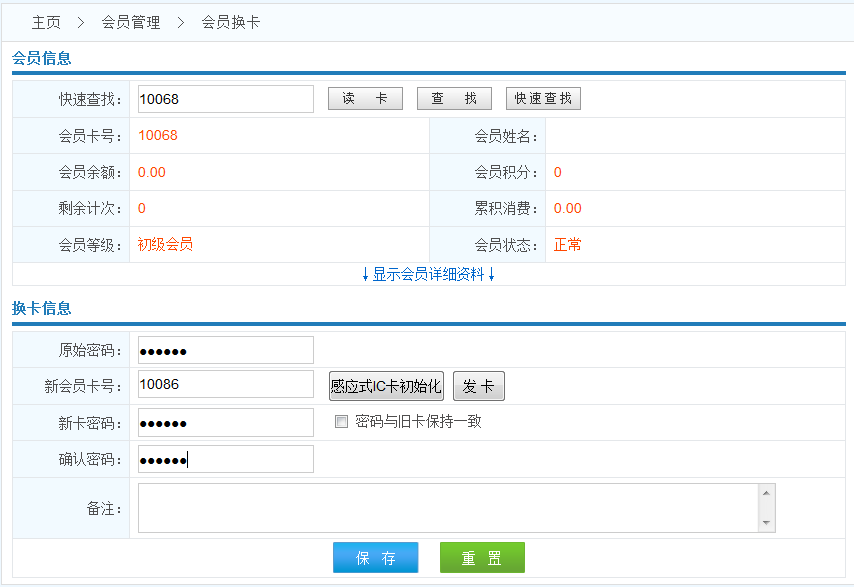 1.當(dāng)會員卡消磁,損壞,或者遺失的時候,商家可以為會員進行換卡操作,在換卡操作后,系統(tǒng)自動將該會員原始數(shù)據(jù)同步到新的會員卡信息內(nèi).