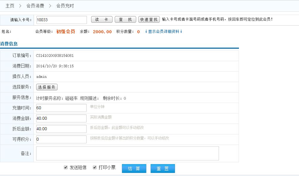 點擊選擇服務按鈕,選擇會員充時的計時服務,然后輸入充時的時間,系統(tǒng)將自動通過選擇的服務的規(guī)則計算出消費金額、可得積分等數(shù)據(jù)并自動填充
